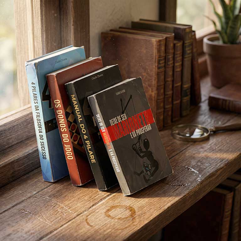 “Cada obra que você vê nesta prateleira é uma peça do quebra-cabeça que eu levei anos para montar. Da lógica estratégica de ‘Os Donos do Jogo’ à reprogramação profunda de ‘Deixe de Ser Marionete’, eu te ofereço as ferramentas para você sair da caixinha e construir uma vida sólida sobre os 4 Pilares. O conhecimento é a única luz que o sistema não pode apagar. Escolha sua porta de entrada e comece sua transformação hoje.”